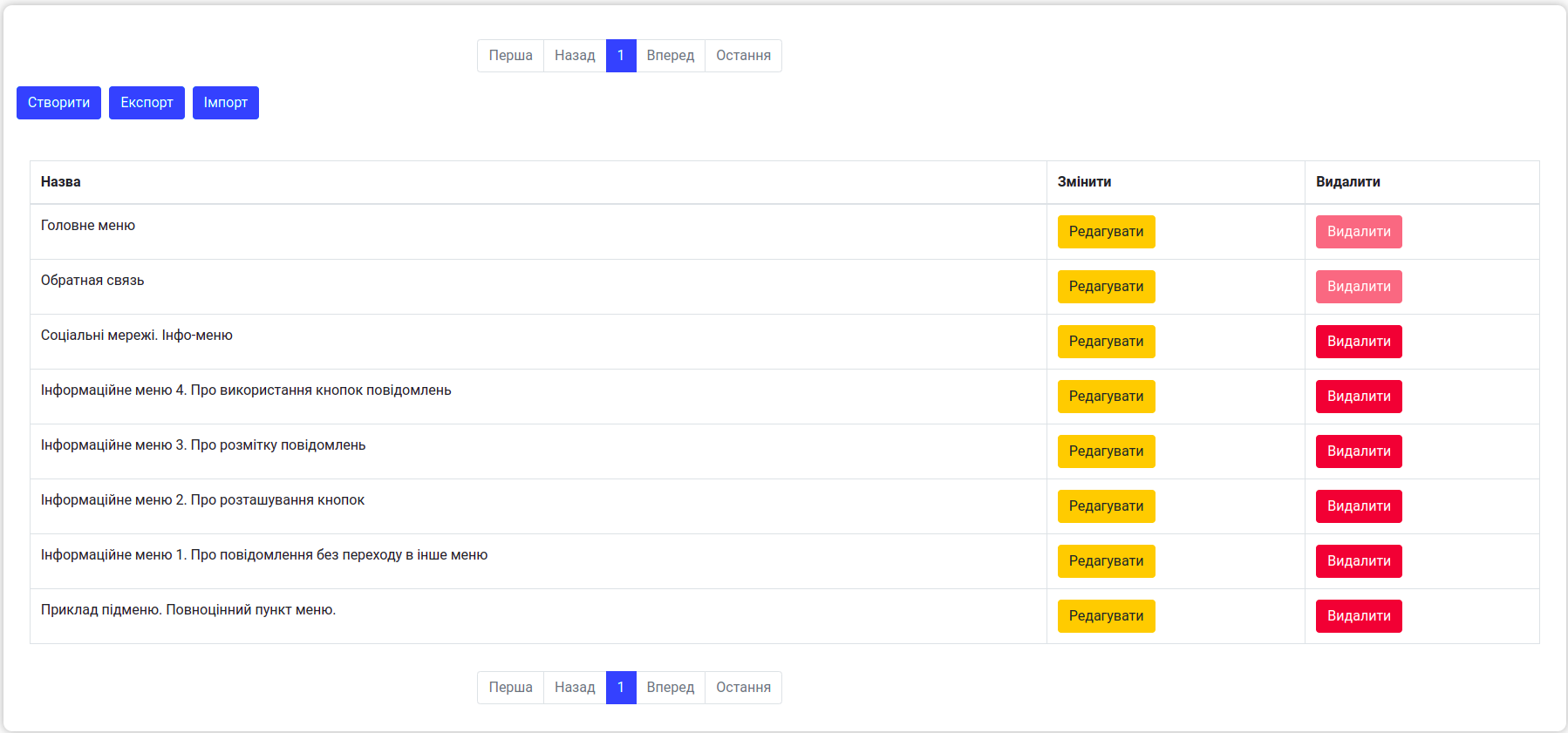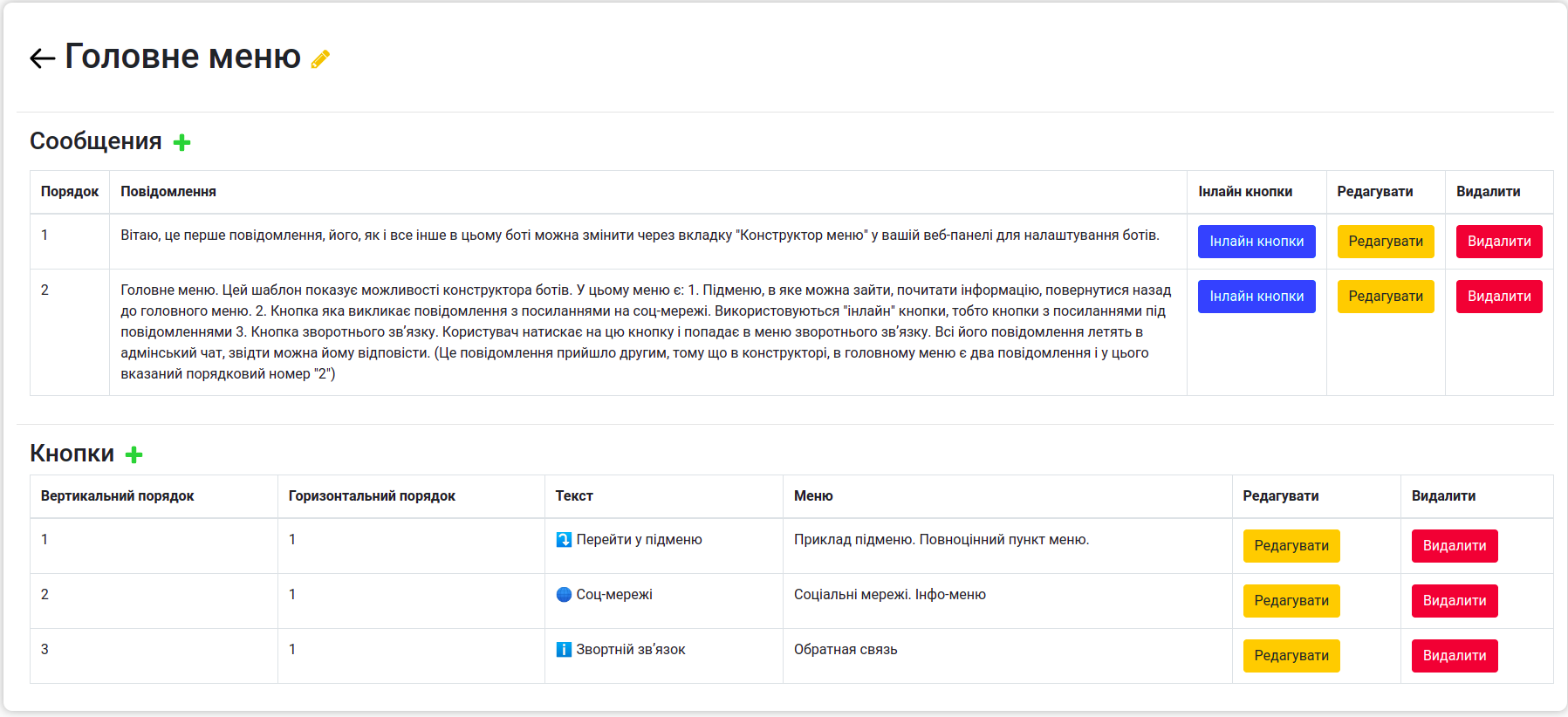 Тобто без програмування ви можете додати навігацію по боту, інформаційні меню будь-якої вкладеності, при цьому не боячись зламати основну структуру боту, тому що кастомна логіка боту та конструктор програмно ізольовані один від одного. При цьому ваш бот поєднає в собі складні функції зроблені нами під замовлення та пункти меню побудовані вами на конструкторі.